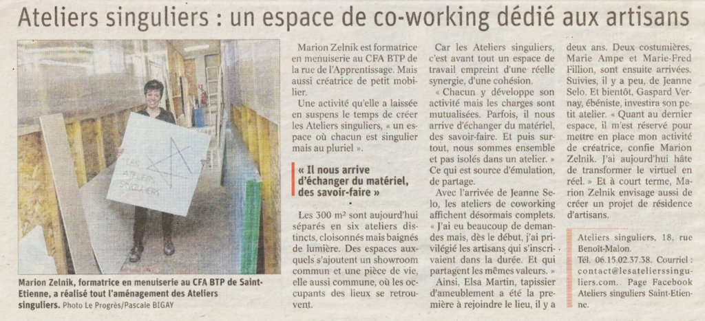 19 avril 2018, avec désormais 5 locataires, Les Ateliers Singuliers sont à retrouver dans La Tribune – Le Progrès.